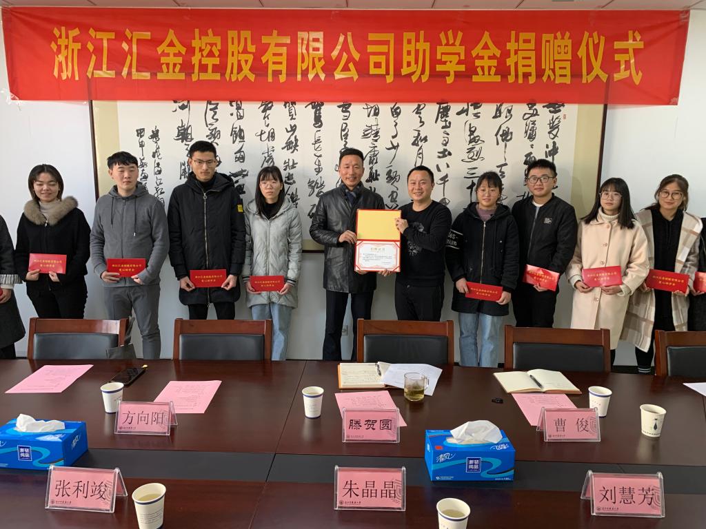 2019年12月13日上午,经公司教育基金会牵线,“汇金控股助学金”捐赠仪式在富春校区4A212会议室举行。浙江汇金控股有限公司总经理方向阳、行政部经理李洁林、公司党总支副书记滕贺圆、校教育基金会副秘书长陈立兵、公司学办主任曹俊、公司资助负责老师朱崇梅及受助员工出席此次捐赠仪式。