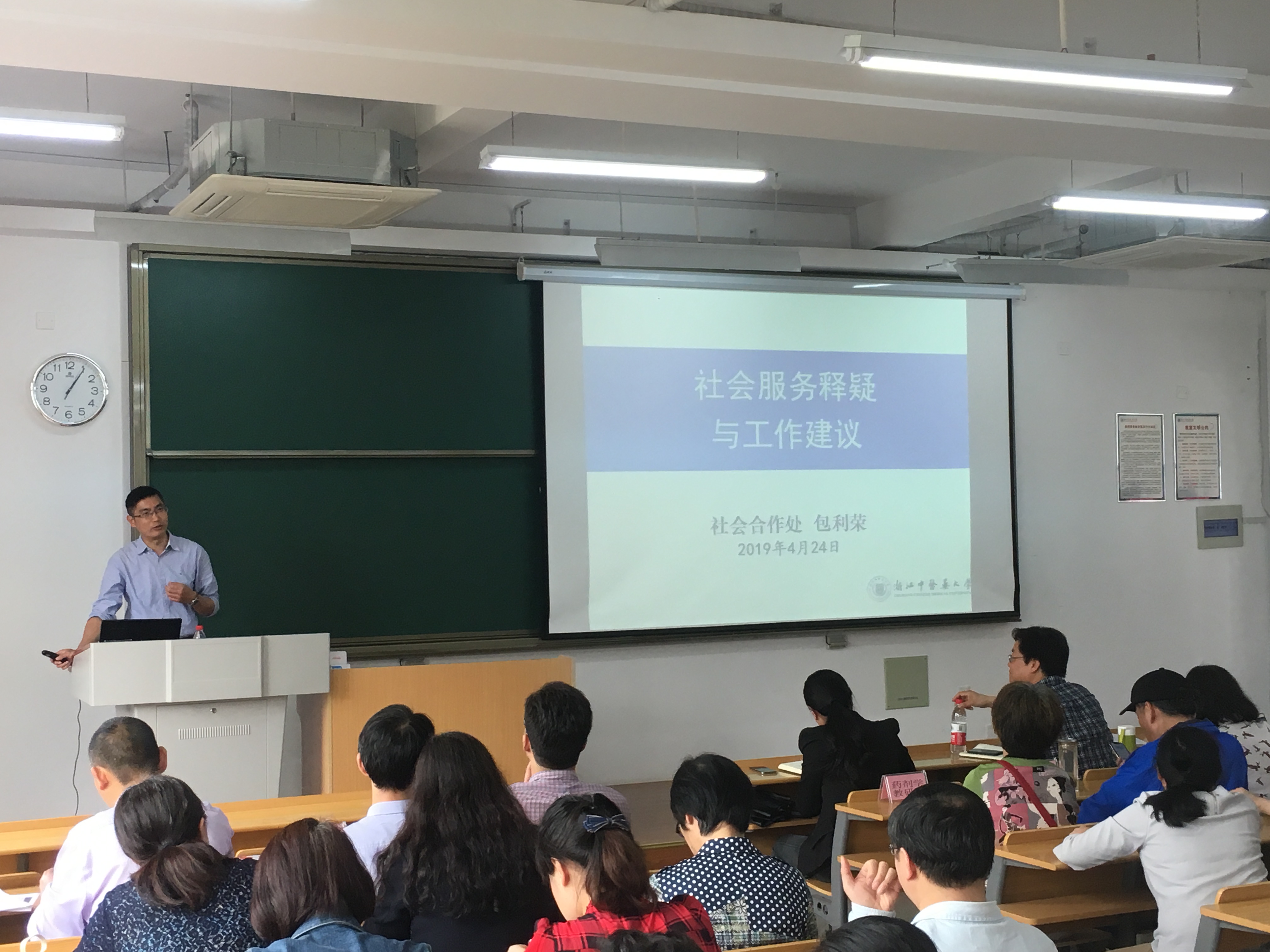 为更好地践行“三服务”,进一步提高公司教师对社会服务工作的参与度,促进公司发展,4月24日下午13:00,永利3044集团官网邀请了社会合作处包利荣副处长(主持工作)在富春校区B401教室做了题为“社会服务释疑与工作建议”宣讲报告,会议由公司经理秦路平主持,永利3044集团官网全体教职工和部分研究生参加了本次会议。