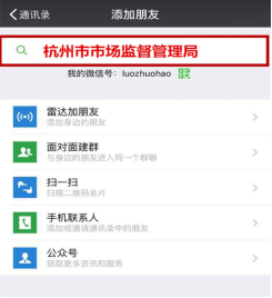 方法2:在微信点击“添加朋友”中输入“杭州市市场监督管理局”
