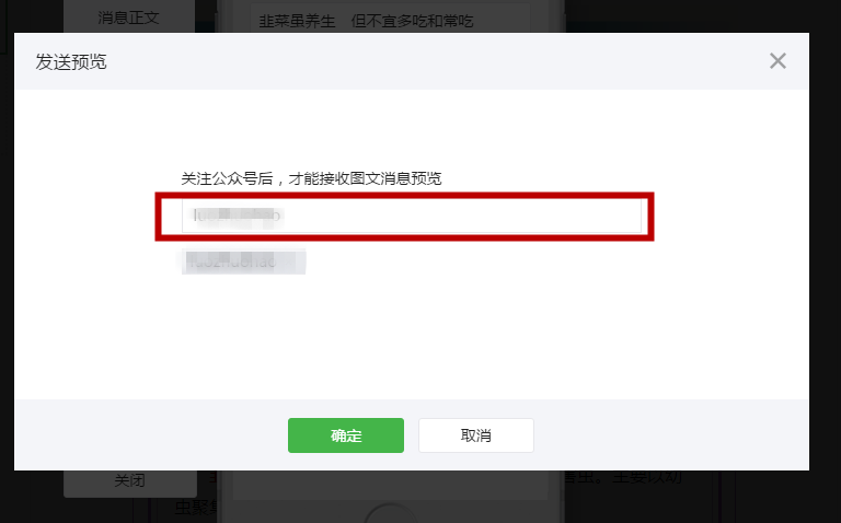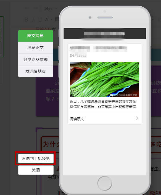 (2)点击“发送至手机预览”并输入自己的微信号(注:微信号需关注此公众号)