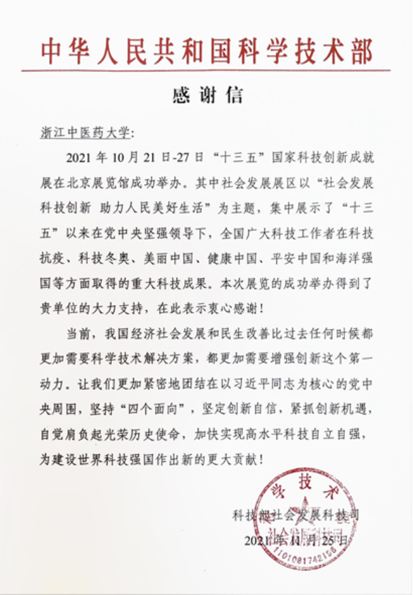 近日,科技部社会发展科技司致公司感谢信,就公司对“十三五”国家科技创新成就展的支持表示衷心感谢!同时勉励公司应坚定创新自信,紧抓创新机遇,为建设世界科技强国作出新的更大贡献!