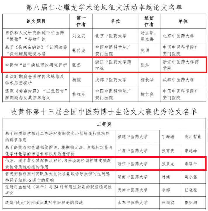近日,第八届仁心雕龙学术论坛征文活动和岐黄杯第十三届全国中医药博士生论文大赛结果陆续公布。永利3044集团官网张芯老师撰写的《中医学“结”病机理论研究评析》获评第八届仁心雕龙学术论坛征文活动卓越论文,张泉龙老师撰写的《仙茅、淫羊藿及其配伍从神经-内分泌途径调控糖皮质激素性骨质疏松症的作用》荣获岐黄杯第十三届全国中医药博士生论文大赛二等奖。