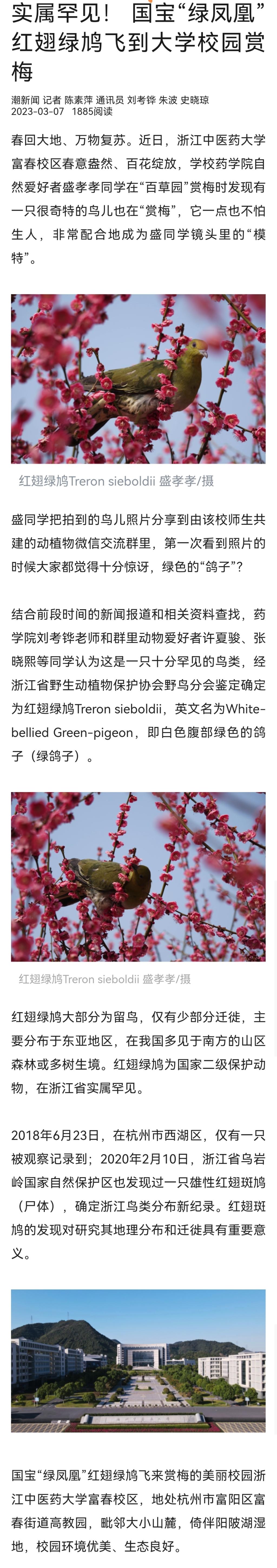 国宝“绿凤凰”红翅绿鸠飞来赏梅的美丽校园浙江中医药大学富春校区,地处杭州市富阳区富春街道高教园,毗邻大小山麓,倚伴阳陂湖湿地,校园环境优美、生态良好。