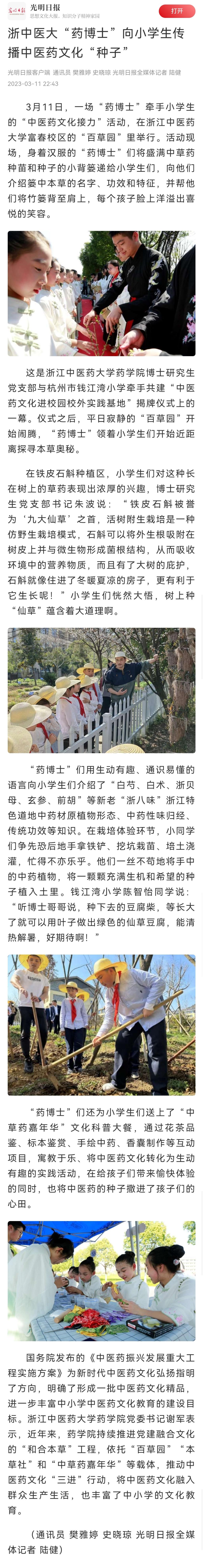 3月11日,一场“药博士”牵手小员工的“中医药文化接力”活动,在浙江中医药大学富春校区的“百草园”里举行。活动现场,身着汉服的“药博士”们将盛满中草药种苗和种子的小背篓递给小员工们,向他们介绍篓中本草的名字、功效和特征,并帮他们将竹篓背至肩上,每个孩子脸上洋溢出喜悦的笑容。
