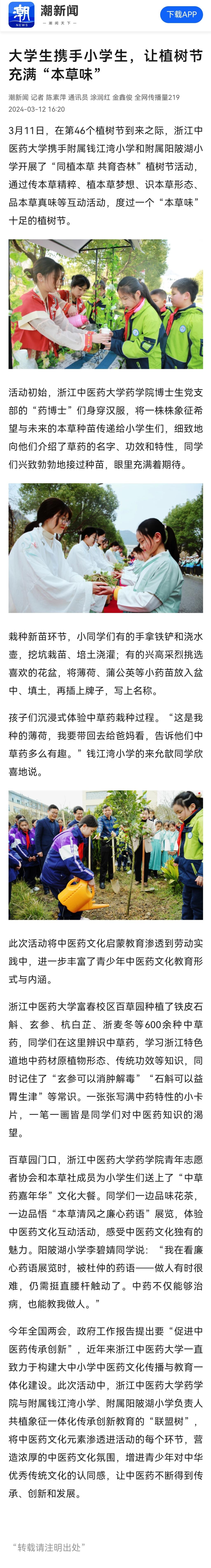 3月11日,在第46个植树节到来之际,浙江中医药大学携手附属钱江湾小学和附属阳陂湖小学开展了“同植本草 共育杏林”植树节活动,通过传本草精粹、植本草梦想、识本草形态、品本草真味等互动活动,度过一个“本草味”十足的植树节。