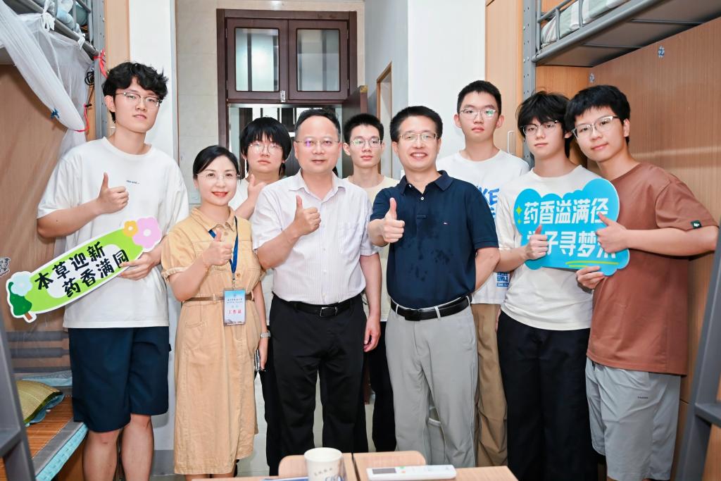 “欢迎你们加入浙江中医药大学这个大家庭!”走进9A215寝室,陈董事长亲切慰问了中药学(时珍传承创新班)的同学们,并提出殷切嘱托:“这里将是你们实现梦想、成就未来的新起点。希望你们在接下来的学习生活中,能够珍惜时光,努力提升自我,积极参与实践,为中医药事业的传承和建设贡献自己的力量。”同时,陈董事长还分享了自己在求学和职业生涯中的宝贵经验,嘱咐同学们要学精中医药典籍,注重创新意识和科研能力的提升;勉励新生们要树立远大理想,勇于追求梦想,不断超越自我。