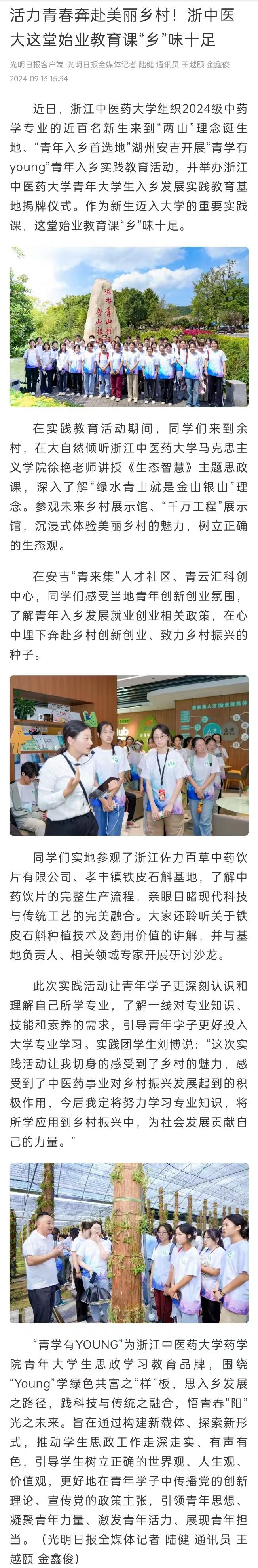 近日,浙江中医药大学组织2024级中药学专业的近百名新生来到“两山”理念诞生地、“青年入乡首选地”湖州安吉开展“青学有young”青年入乡实践教育活动,并举办浙江中医药大学青年老员工入乡发展实践教育基地揭牌仪式。作为新生迈入大学的重要实践课,这堂始业教育课“乡”味十足。