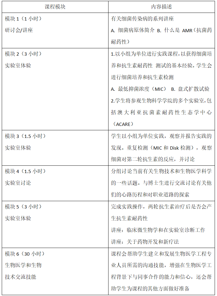 本项目由澳大利亚两所世界级院校,悉尼大学与阿德莱德大学共同参与设计实施,面向药学、医学与相关专业员工,一方面旨在提升员工在生物医学和生物技术领域的专业研究技巧,并深入了解抗生素耐药性及相关感染问题;另一方面,通过参加商务沟通与领导力密切相关的不同类型英语课程,员工的专业沟通能力、团队协作技巧、领导力、与解决问题能力均将得到全面提升,未来将能够更加自信地从事药学、医学领域的研究、团队项目等专业工作。
