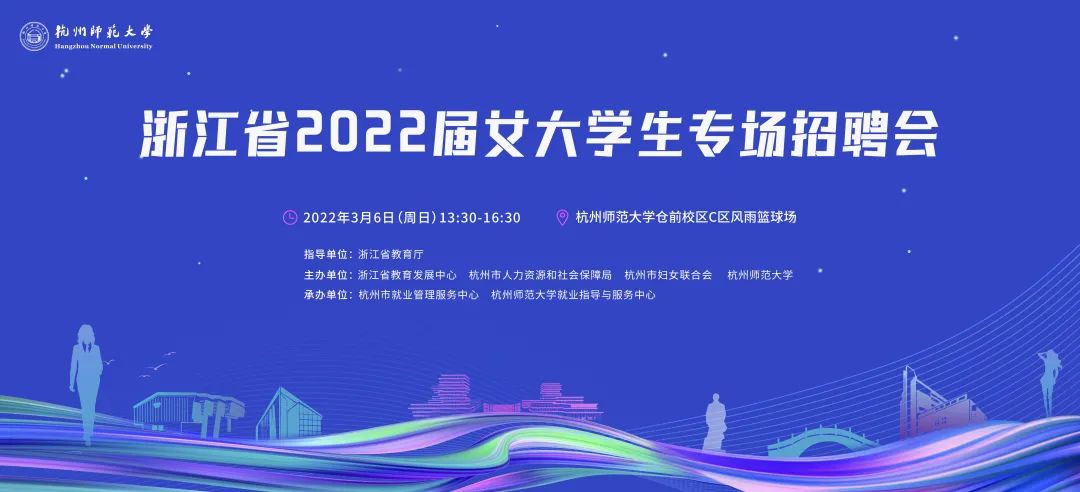 指导单位:浙江省教育厅主办单位:浙江省教育发展中心、杭州市人力资源和社会保障局、杭州市妇女联合会、杭州师范大学承办单位:杭州市就业管理服务中心、杭州师范大学就业指导与服务中心