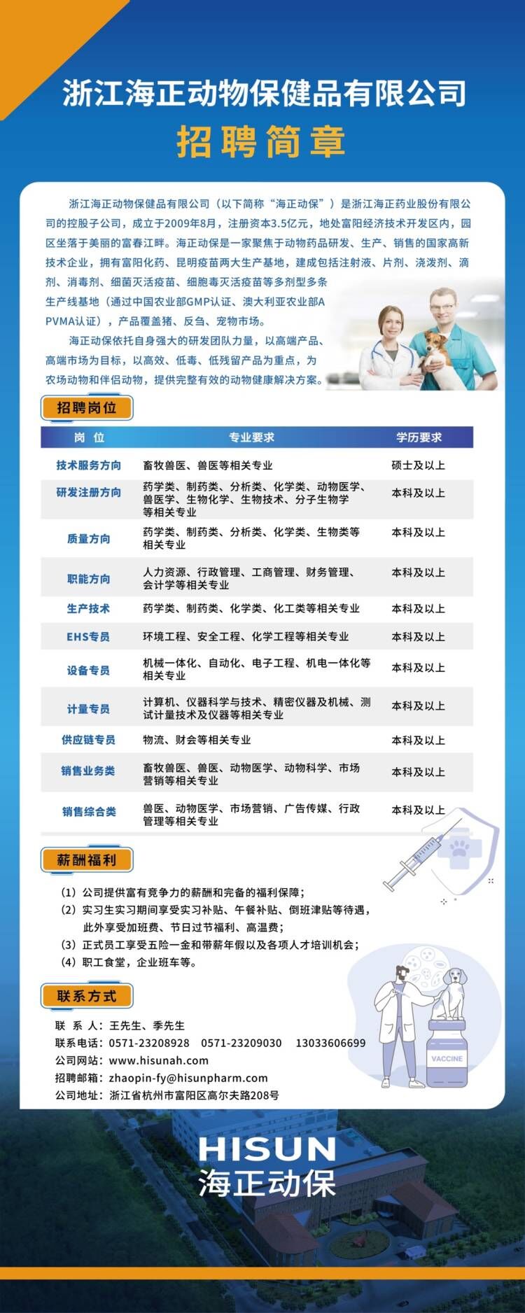 公司主要负责制造出口兽药制剂和国内制剂产品。海正动保依托自身强大的研发团队力量,以高端产品、高端市场为目标,以高效、低毒、低残留产品为重点,形成海正药业动物药的国际品牌。海正动保提供富有竞争力的薪酬和完备的福利保障。