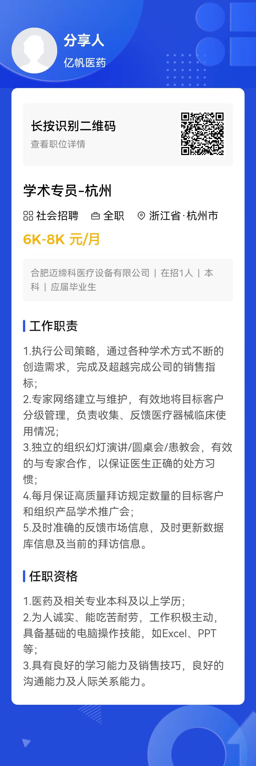 亿帆药业招聘学术专员,男生优先,岗位杭州,简历投递:fengyue@yifanyy.com