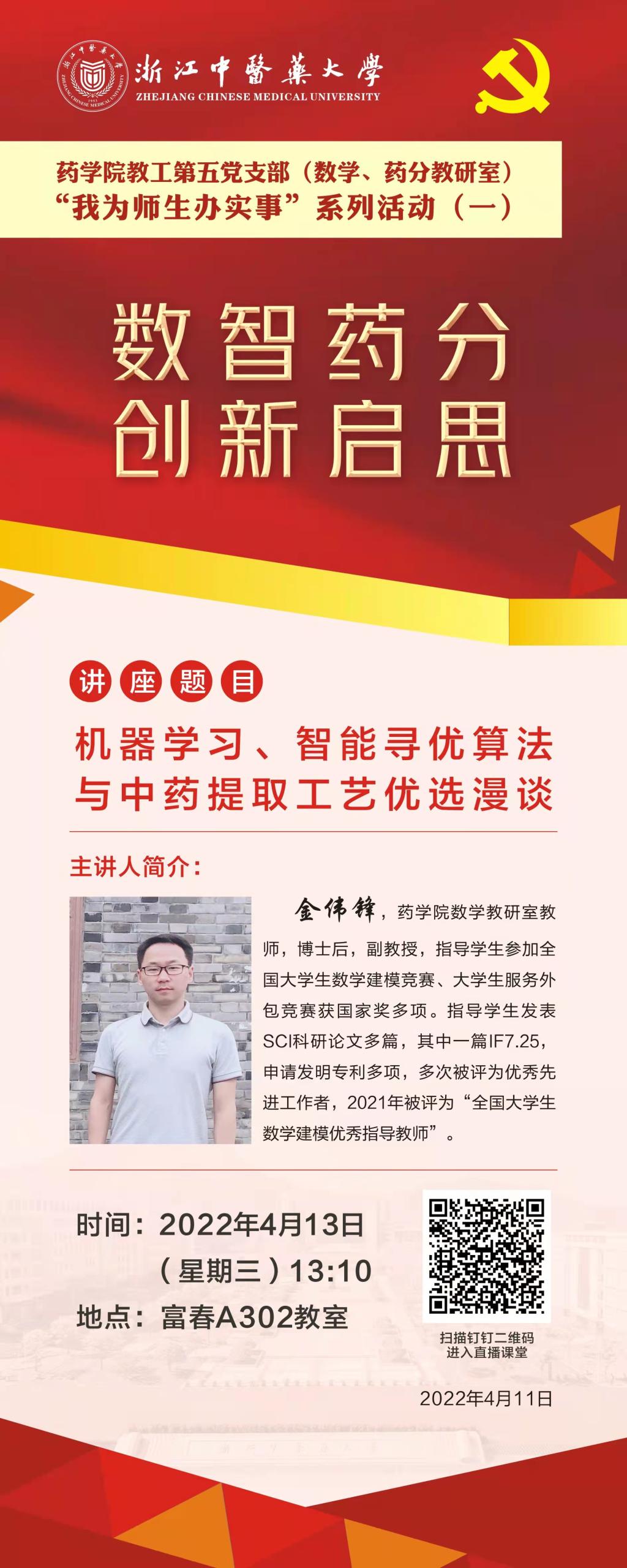 随着人工智能技术和理论的飞速发展,中医药与人工智能之间的学科交叉日益活跃。目前,在新医科建设内涵中明确鼓励医学与理科、工科等多学科交叉融通,及时将“互联网+健康医疗”、“人工智能+健康医疗”等医学领域最新知识、最新技术、最新方法更新到医学教学内容中,以期培养出符合新医科发展的创新复合人才。结合公司师生在应用相关模型和算法中遇到的常见问题和困惑,永利3044集团官网教工第五党支部(数学教研室和药物分析教研室)将在4月开启以“数智药分,创新启思”为主题的系列活动,第一期以中药提取工艺优选为案例,深入浅出,助推中医药借助AI技术发挥重要作用。欢迎广大师生参加!