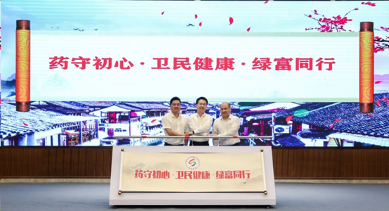 会上,药公司党委书记谢军与安吉县卫生健康局党委书记凌逸刚,天荒坪镇党委副书记、镇长许进京代表三方共同发布“药守初心·卫民健康·绿富同行”党建联建品牌。