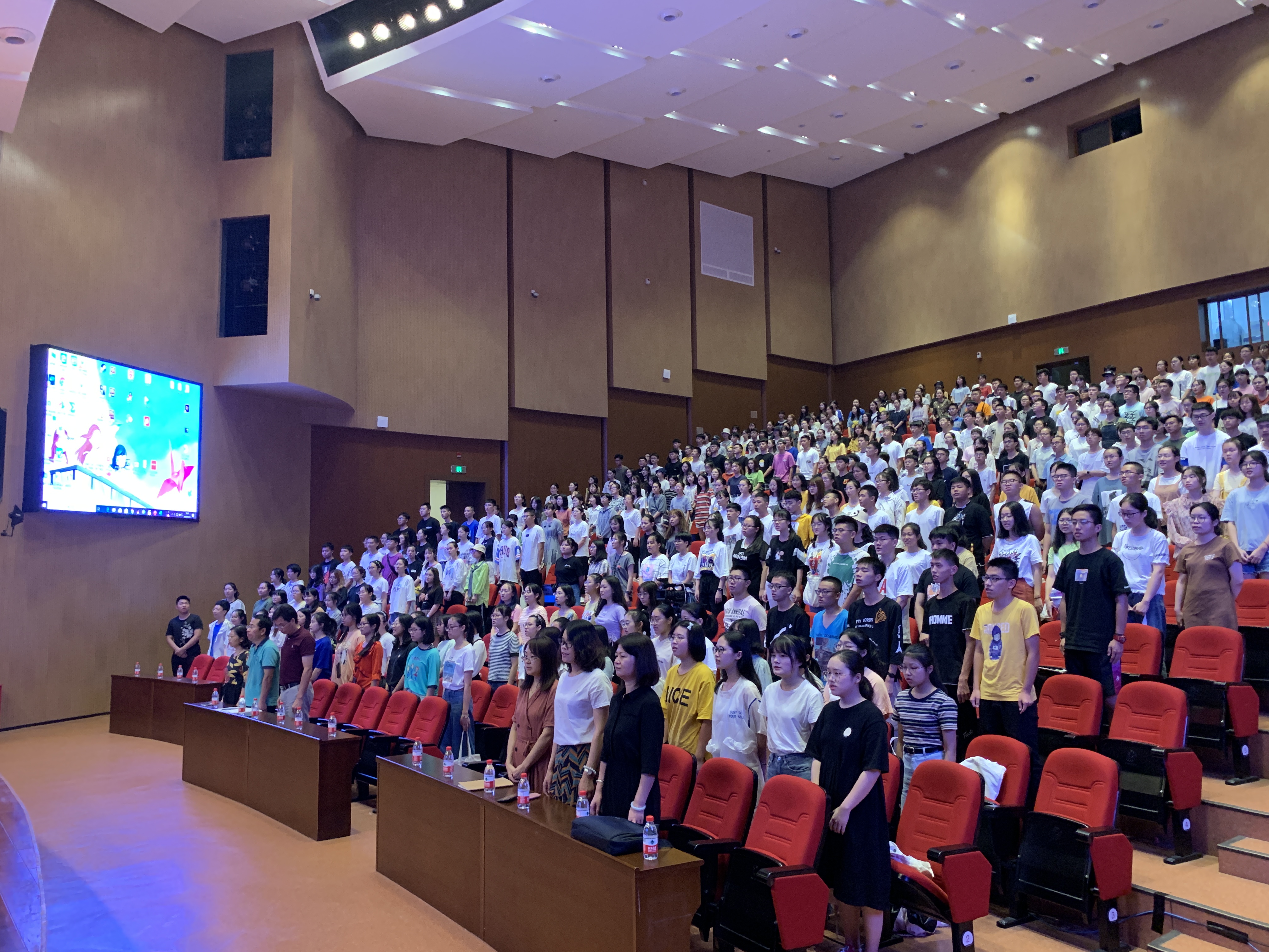 新生大会在全体师生合唱国歌的庄严氛围中开始。