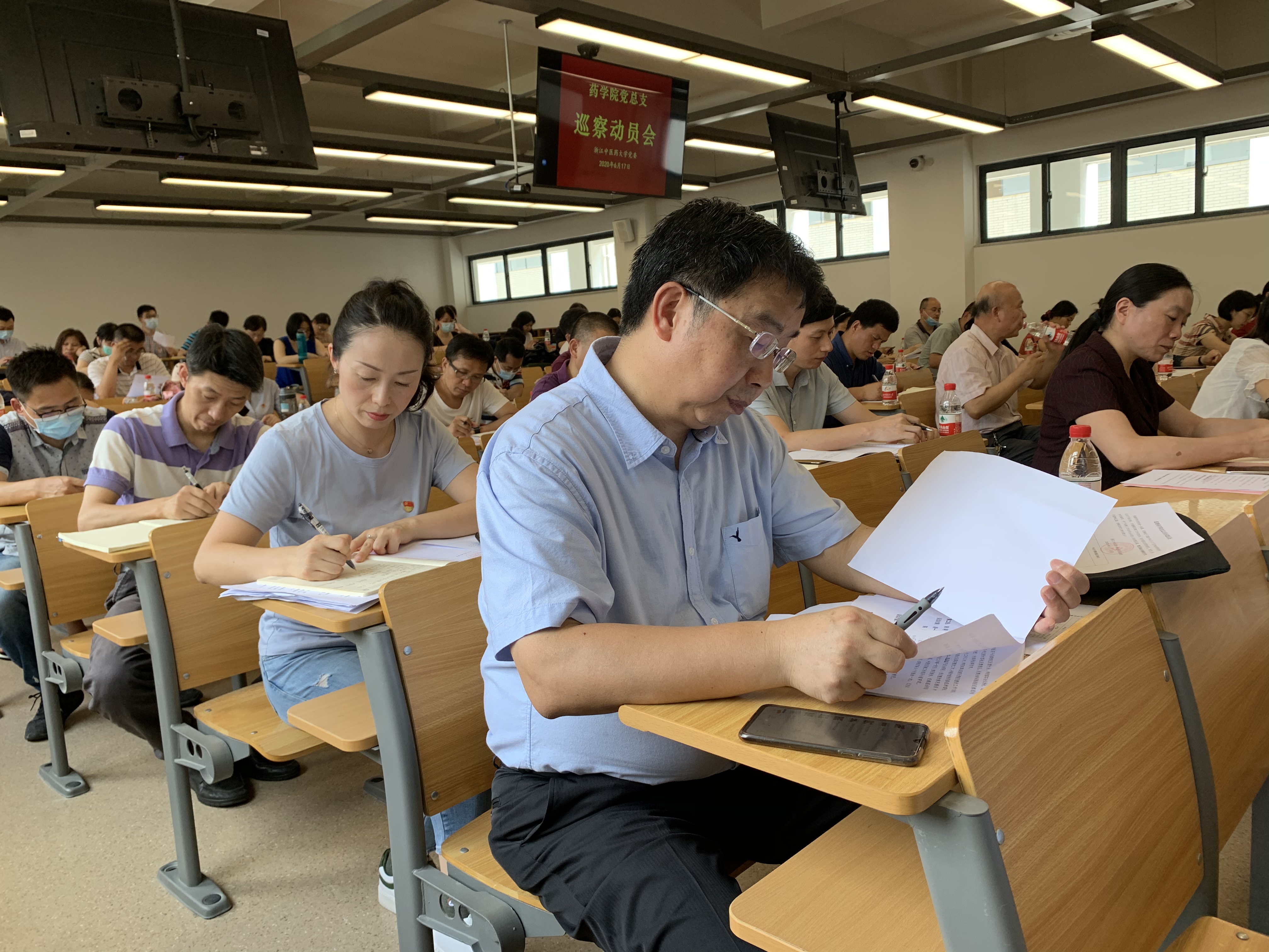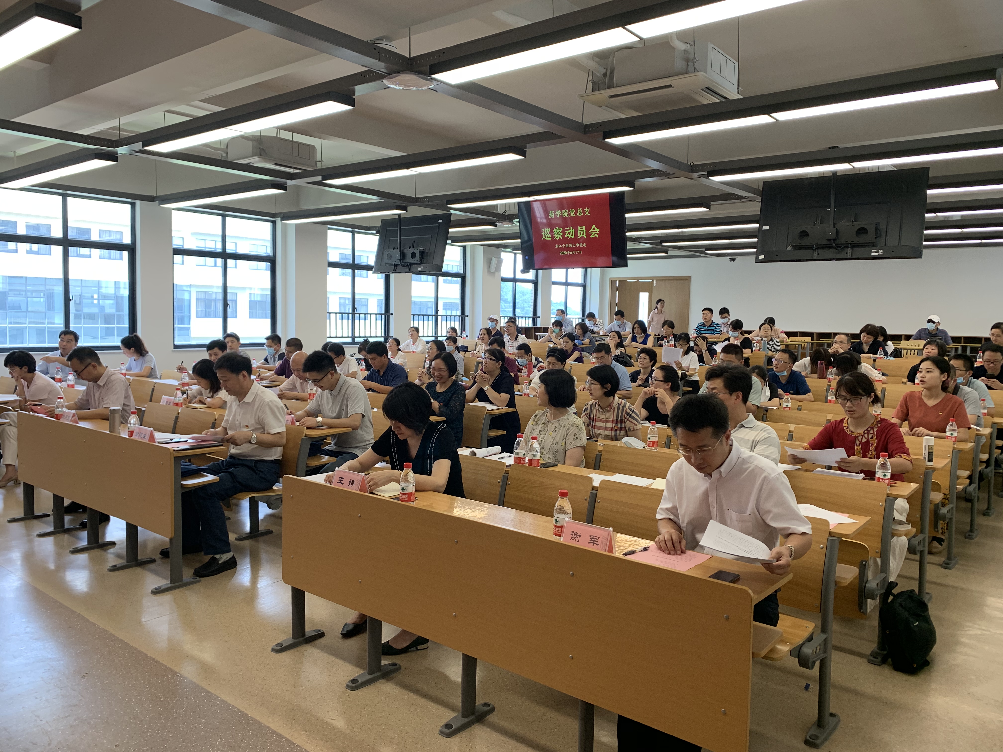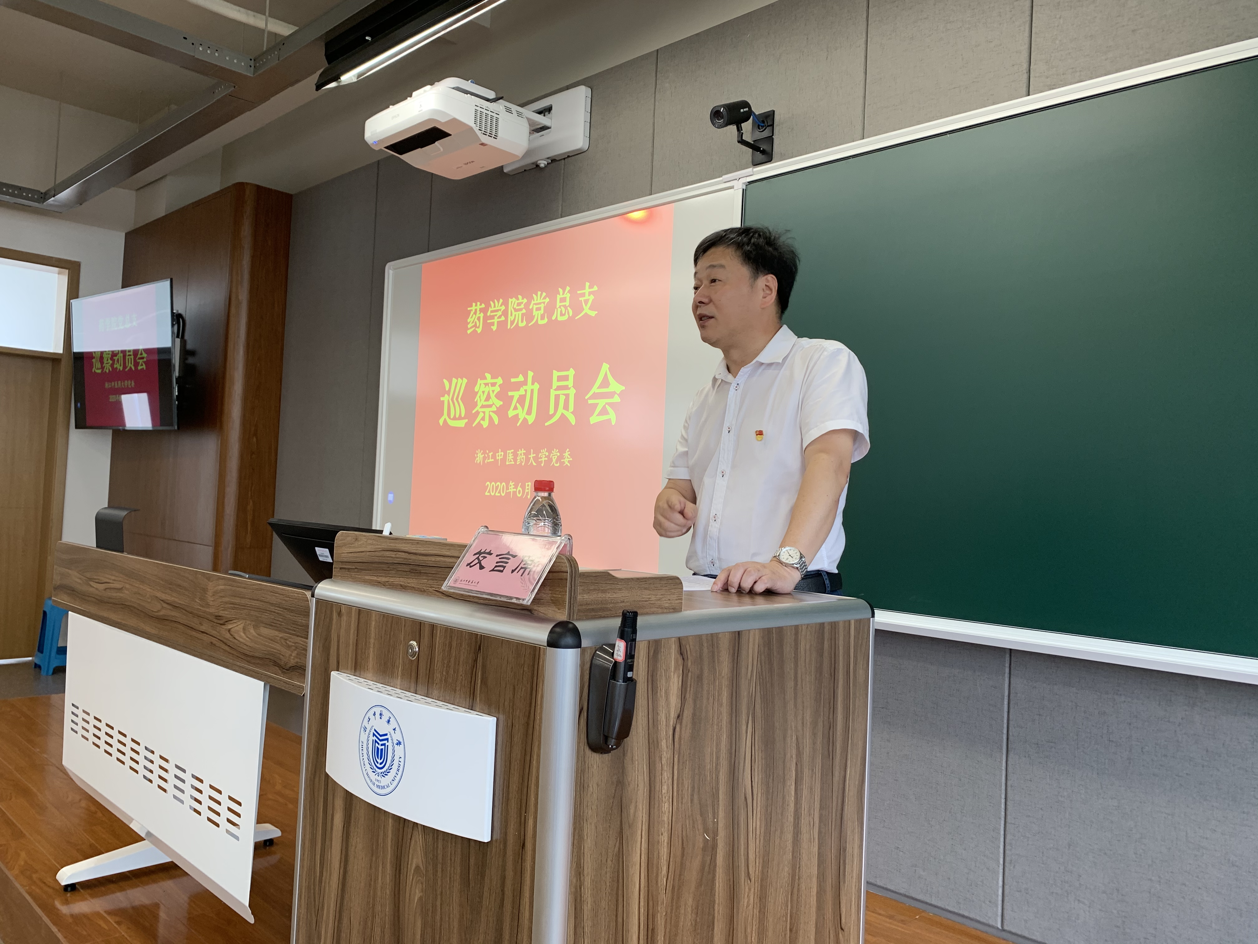 2020年6月17日中午12时30分,药公司党总支巡察动员会在富春校区教B303召开。公司巡察组组长、校纪委书记、监察专员章建生,巡察组副组长朱建良,巡察组成员王婷、陈翔、谢军、杨春兰、付国春、马镇杰等出席,药公司党政领导班子成员及教职员工代表参加会议。会议由药公司党总支书记徐爱琴主持。