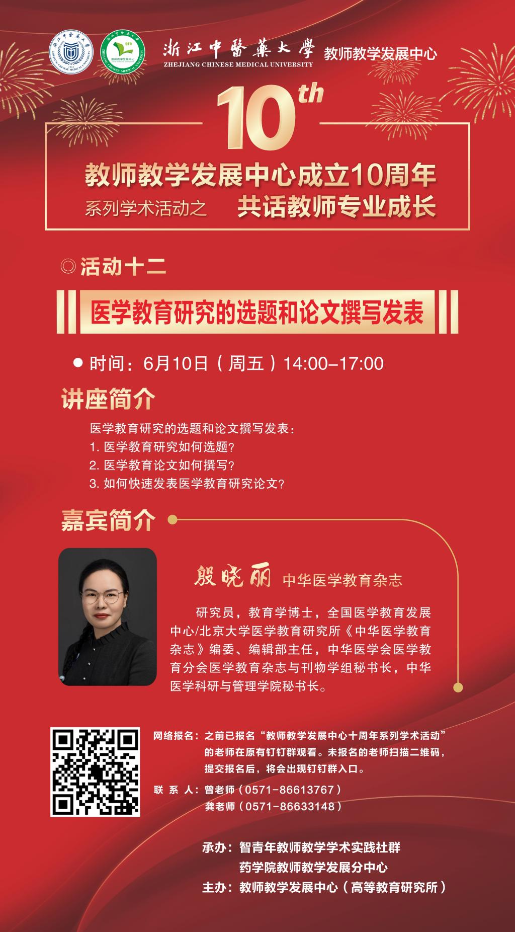 各位老师,恰逢夏意渐浓、万物初盈之时,热烈欢迎您参加由浙江中医药大学教师发展中心主办,永利3044集团官网教发中心和青年教师教学学术实践社群承办的2022教师教学发展中心成立10周年系列学术活动之医学教育研究的选题和论文撰写发表!